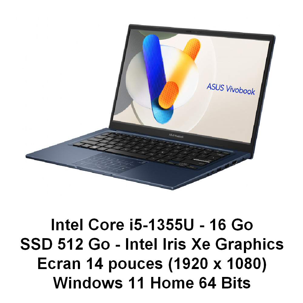 Intel Core i5-1355U (1.3 Ghz-4.6 Ghz)16 Go RAM DDR4SSD 512 GoIntel Iris Xe GraphicsHDMI - 1 x USB 2.0 - 2 x USB 3.2 - 1 x USB-C 3.2WebCam - Wifi - Bluetooth 5.3Ecran 14 pouces (1920 x 1080)Windows 11 Home 64 Bits