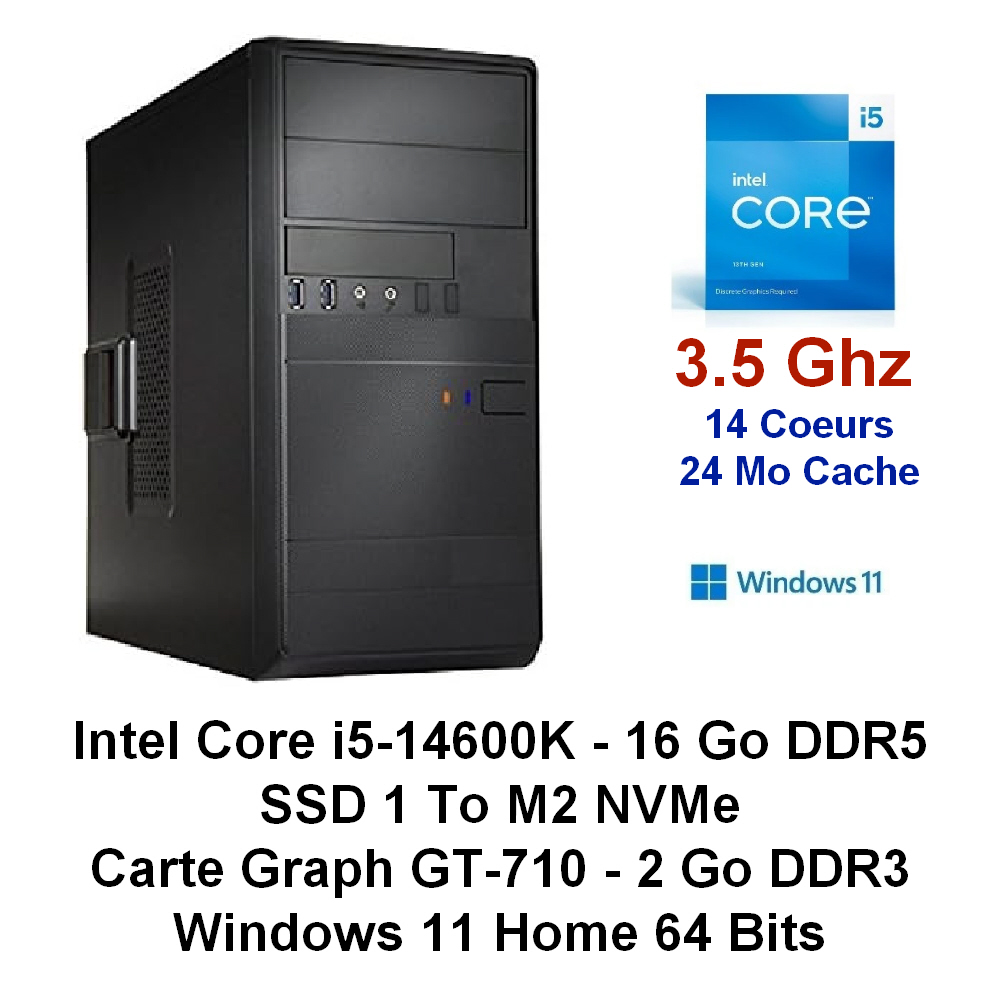 Boitier Moyen tour micro ATX 480 WattsCarte mère Gigabyte /MSI B760M (socket 1700) WifiCPU: Intel Core i5-14600k (3.5 Ghz - 14 coeurs- 24 Mo Cache)16 Go RAM DDR5SSD 1 To M2 NVme KingstonCarte graphique GT-710 - 2 Go DDR3Windows 11 Home 64 bits