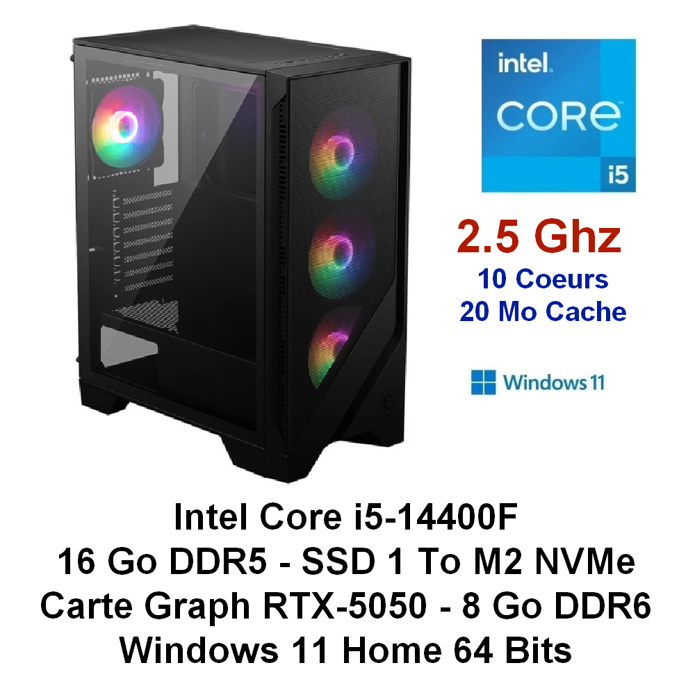 Boitier tour ATX MSI MAG Forge 120A AirFlowAlimentation 550 WattsCarte mère B760 CPU: Intel Core i5-14400F (2.5 Ghz - 10 coeurs)16 Go RAM DDR4SSD 1 To M2 NVMe Carte Graphique GeForce RTX-5050 8 Go DDR6Windows 11 Home 64 Bits
